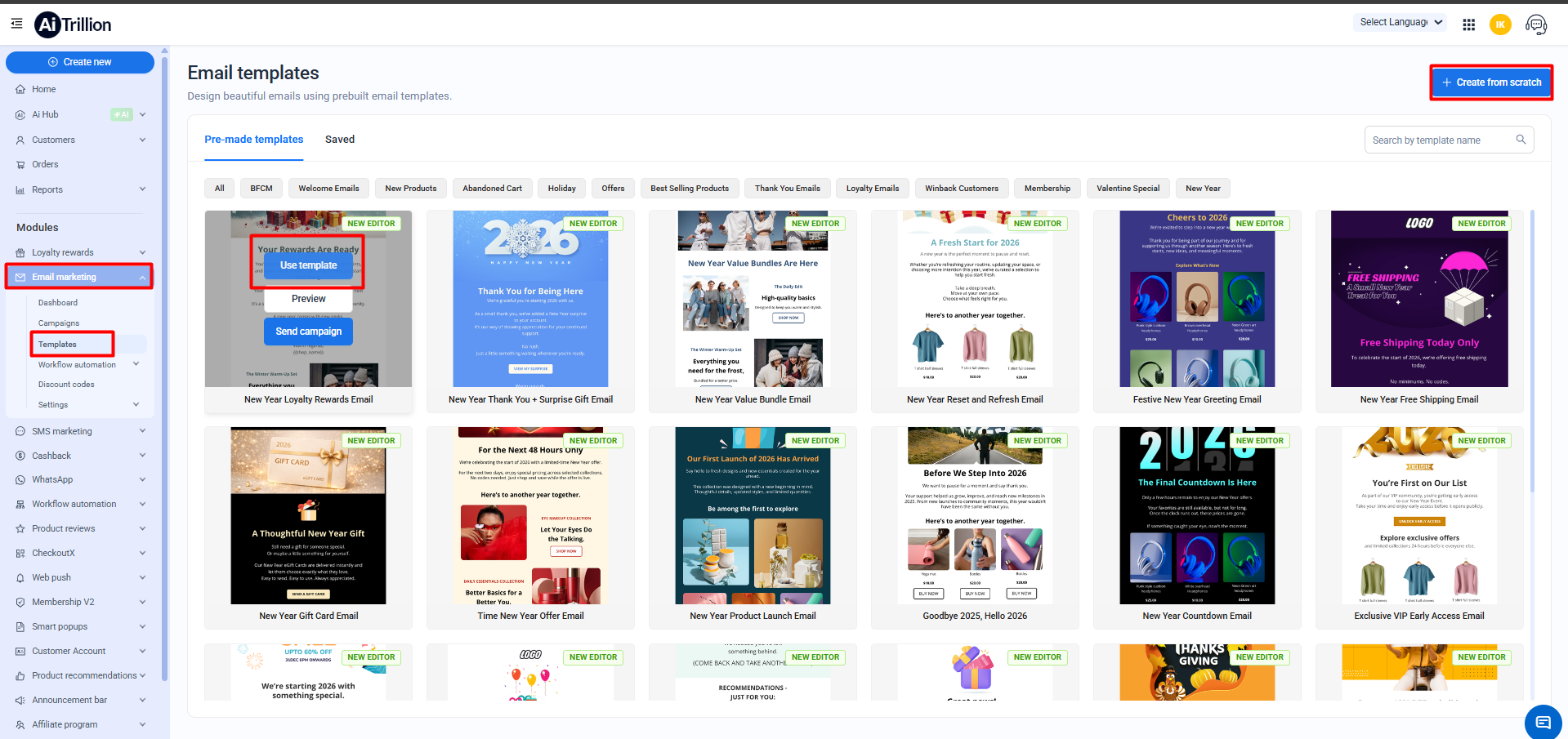 Step 3: Go to Email marketing >> Templates >> Either click on the Create from scratch button to create a new template, or use the pre-made template or Saved template.