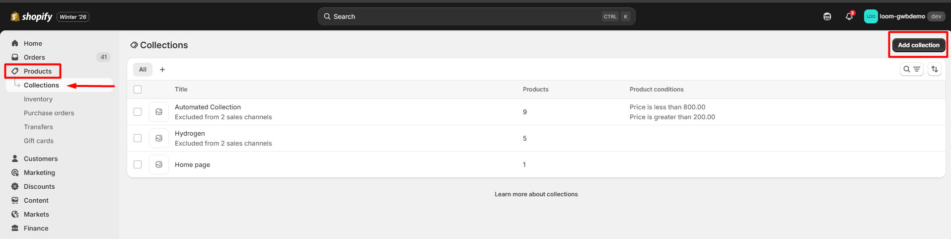 Step 1: Go to Shopify admin >> Click on Products >> Click on Collection >> Click on Add collection.