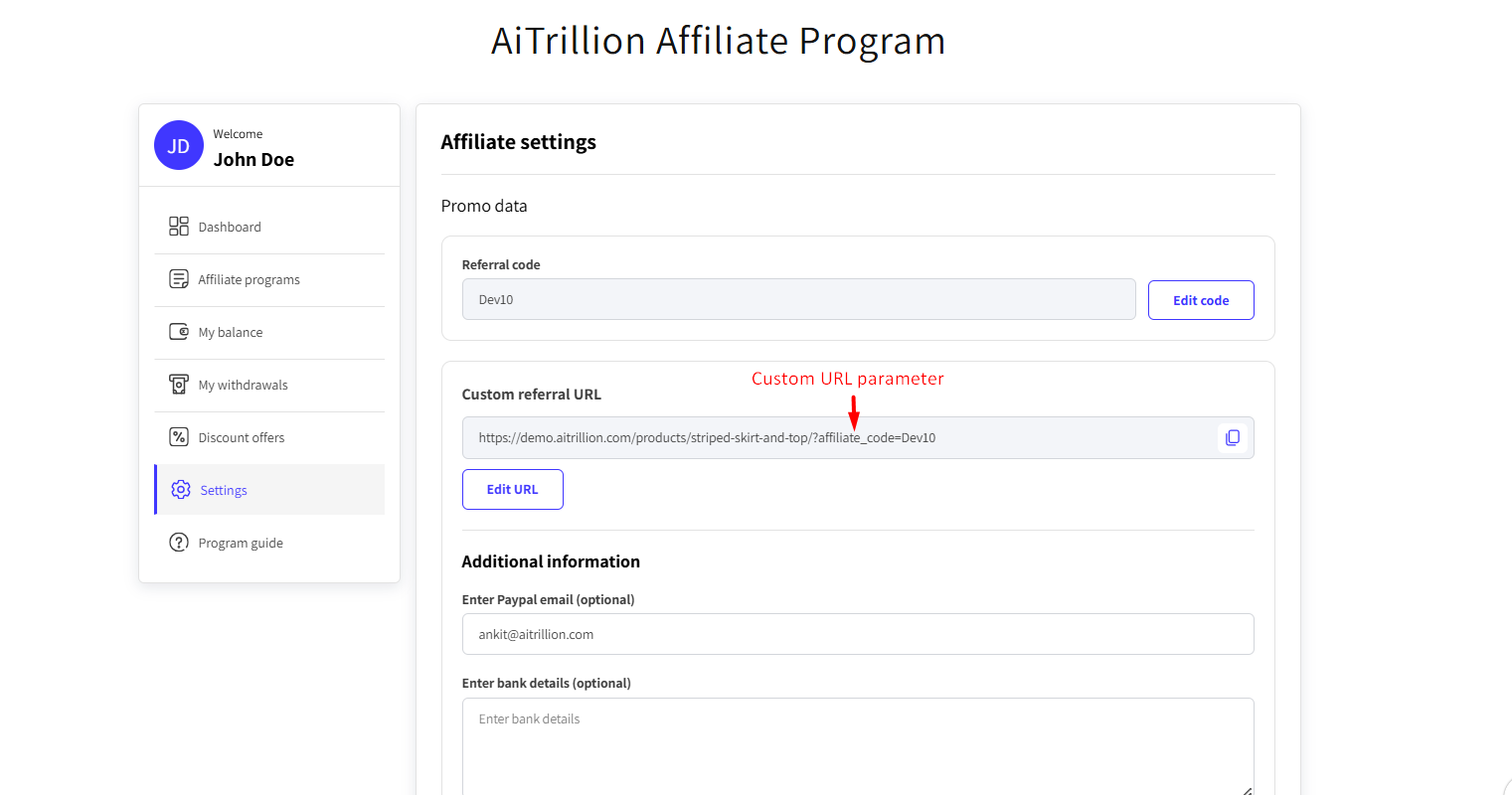 Example: If the parameter is set as affiliate_code, a link will look like this: