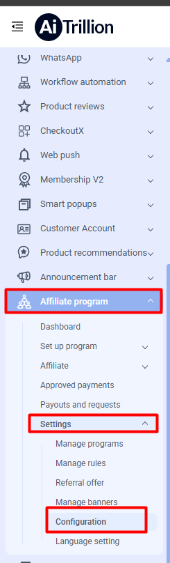 Step 1: Go to Affiliate Program >> Settings >> Configuration