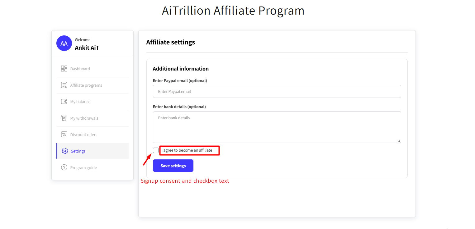 The text shown beside the checkbox that customers must agree to when signing up for the affiliate program.