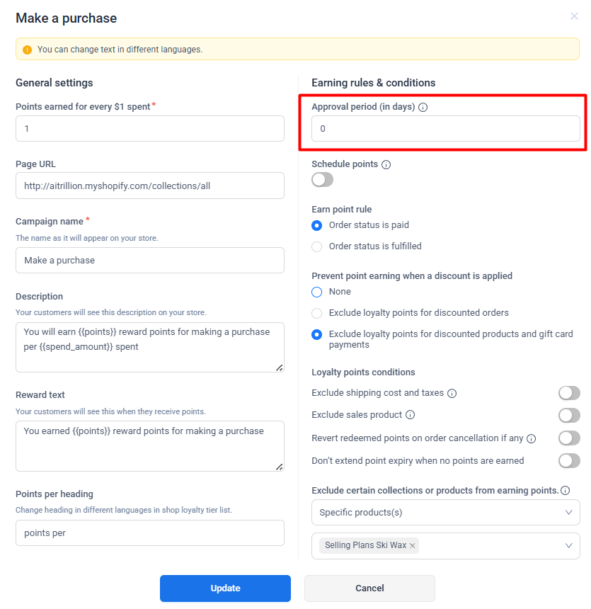 Approval period of Loyalty Points on the Make a Purchase Activity