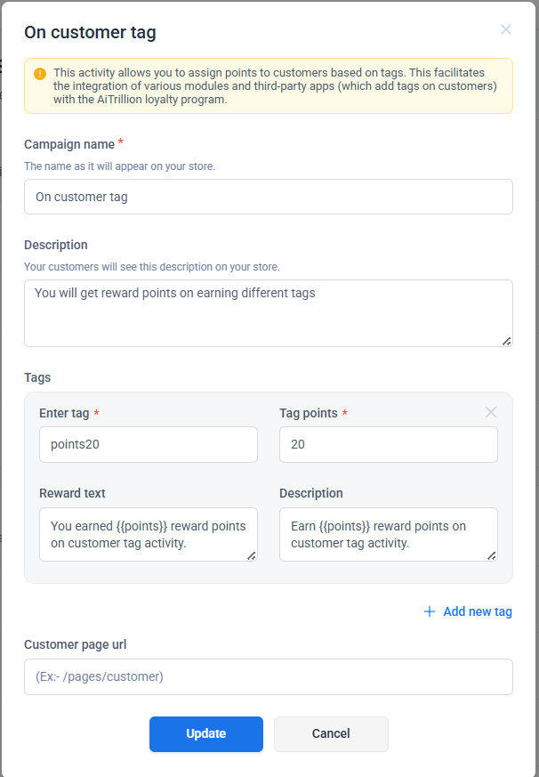 Tags Points: Tags Points refer to the number of reward points customers earn when they're associated with a particular tag.