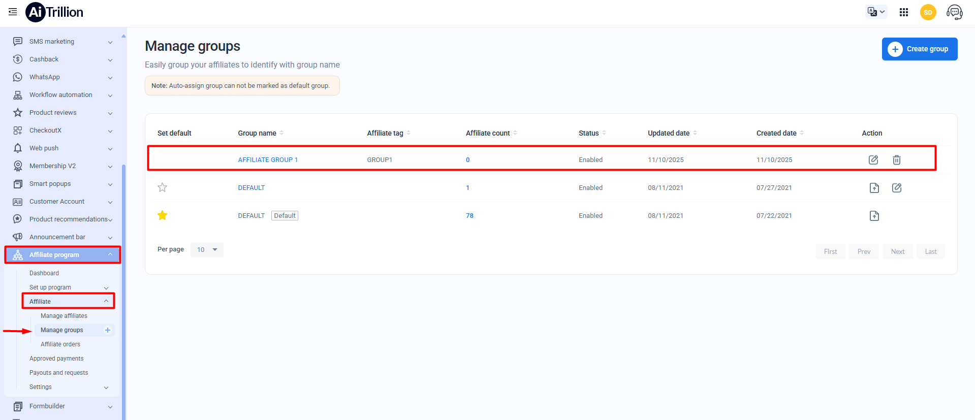 Step 1: Go to Affiliate program >> Affiliate >> Manage group >> Create group Or Edit group