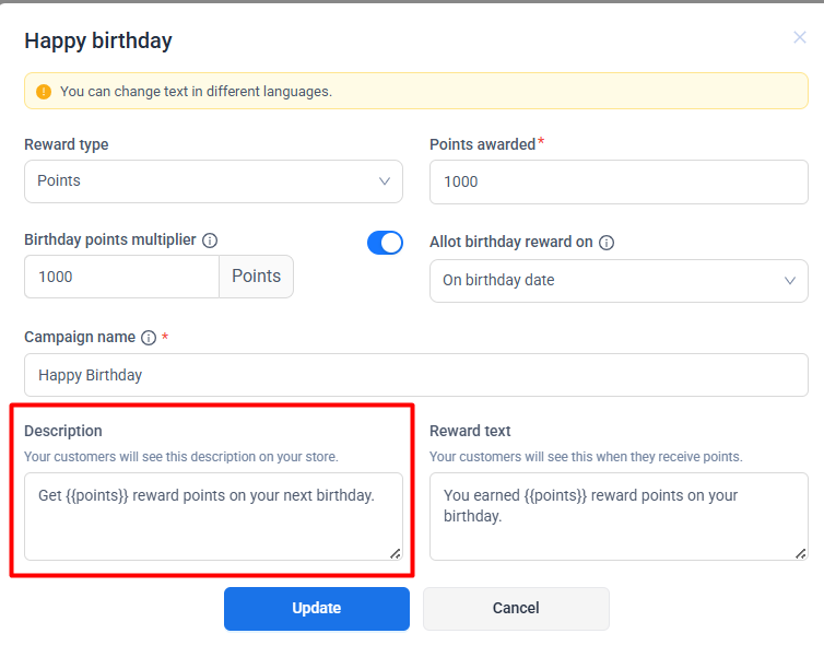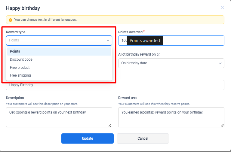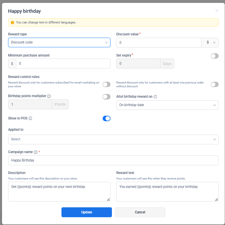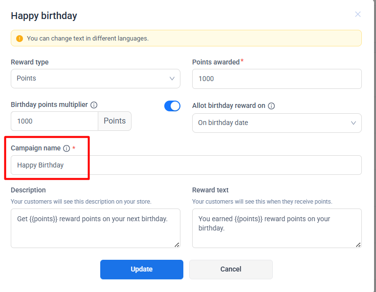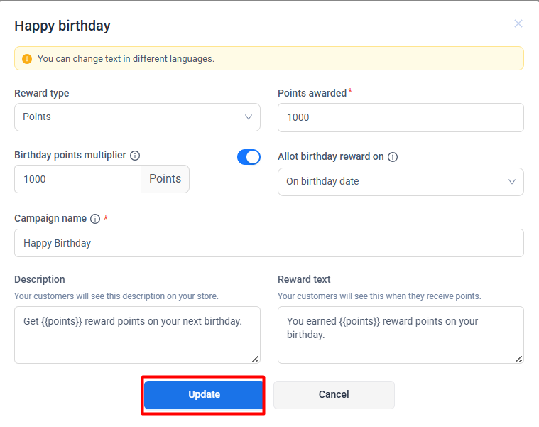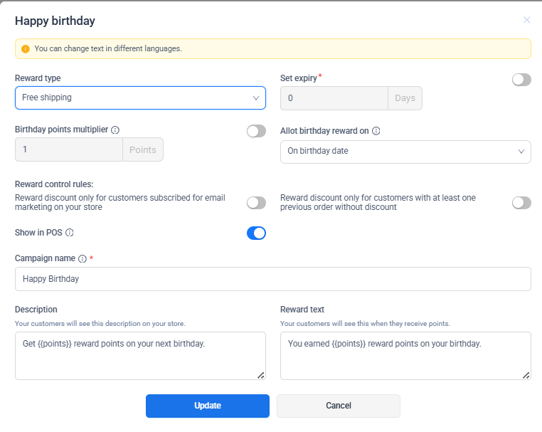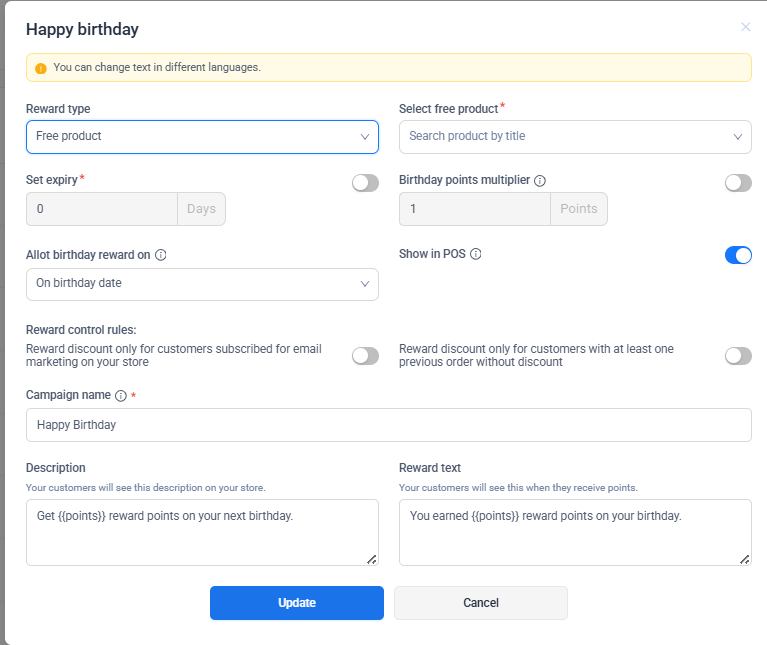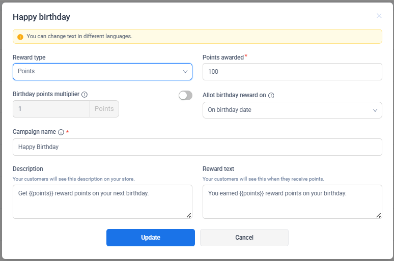 Changes made to birthday reward settings apply to future birthdays only and do not affect rewards already granted.