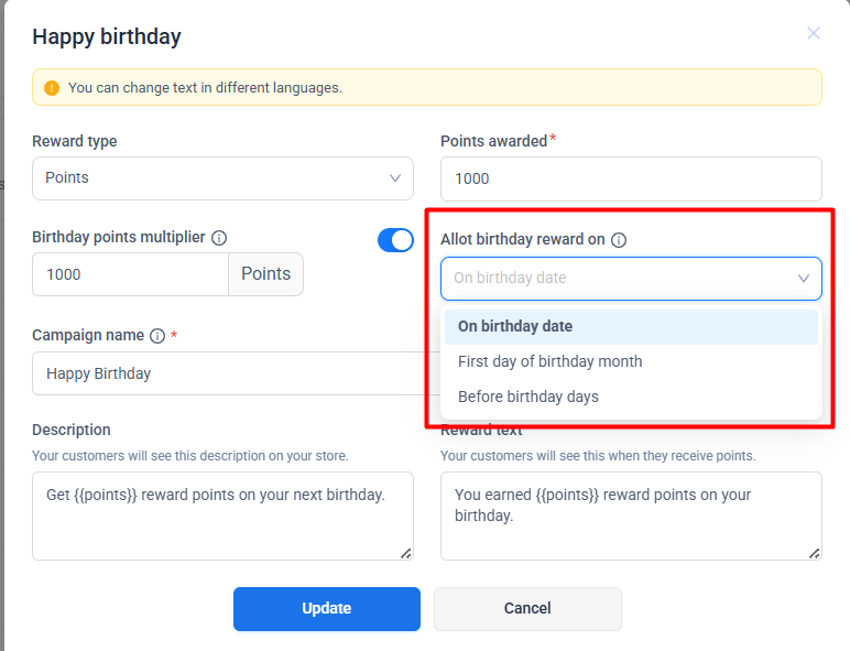 Before birthday days → You will get an option to choose the time period before the customer’s birthday for sending the reward.