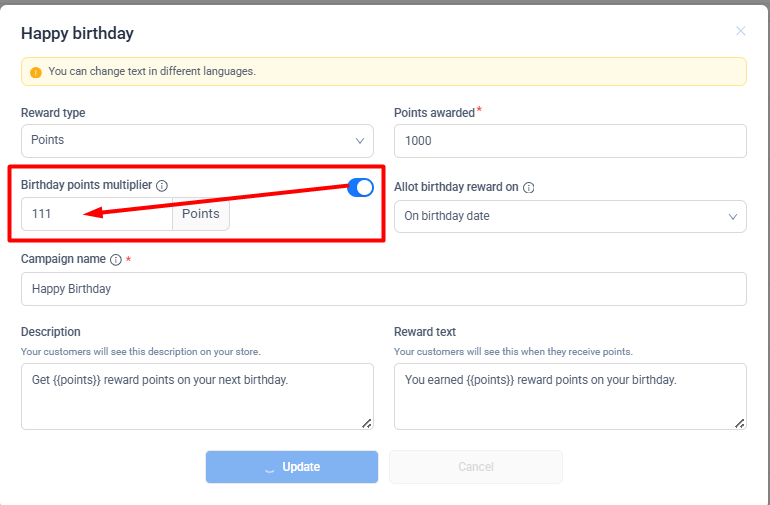 Example: Multiplier = 2, If they normally earn 1 point per $1 spent → They will earn 2 points per $1 during their birthday reward period.