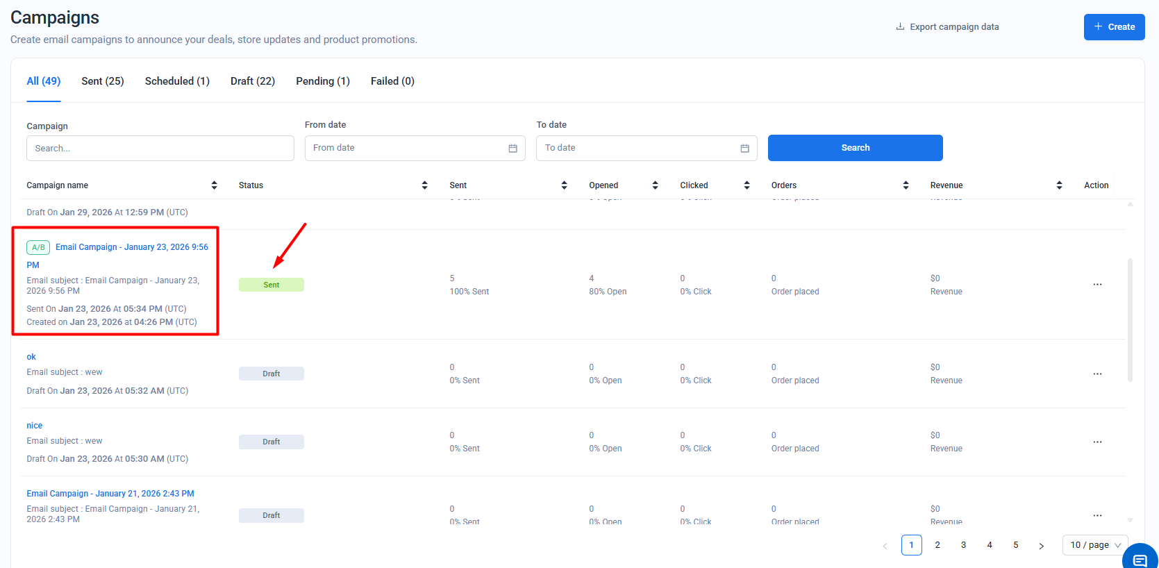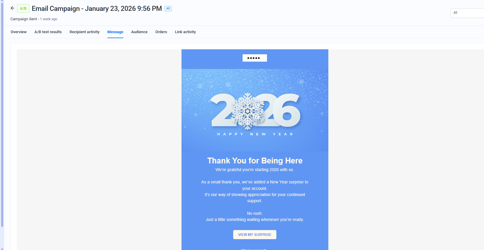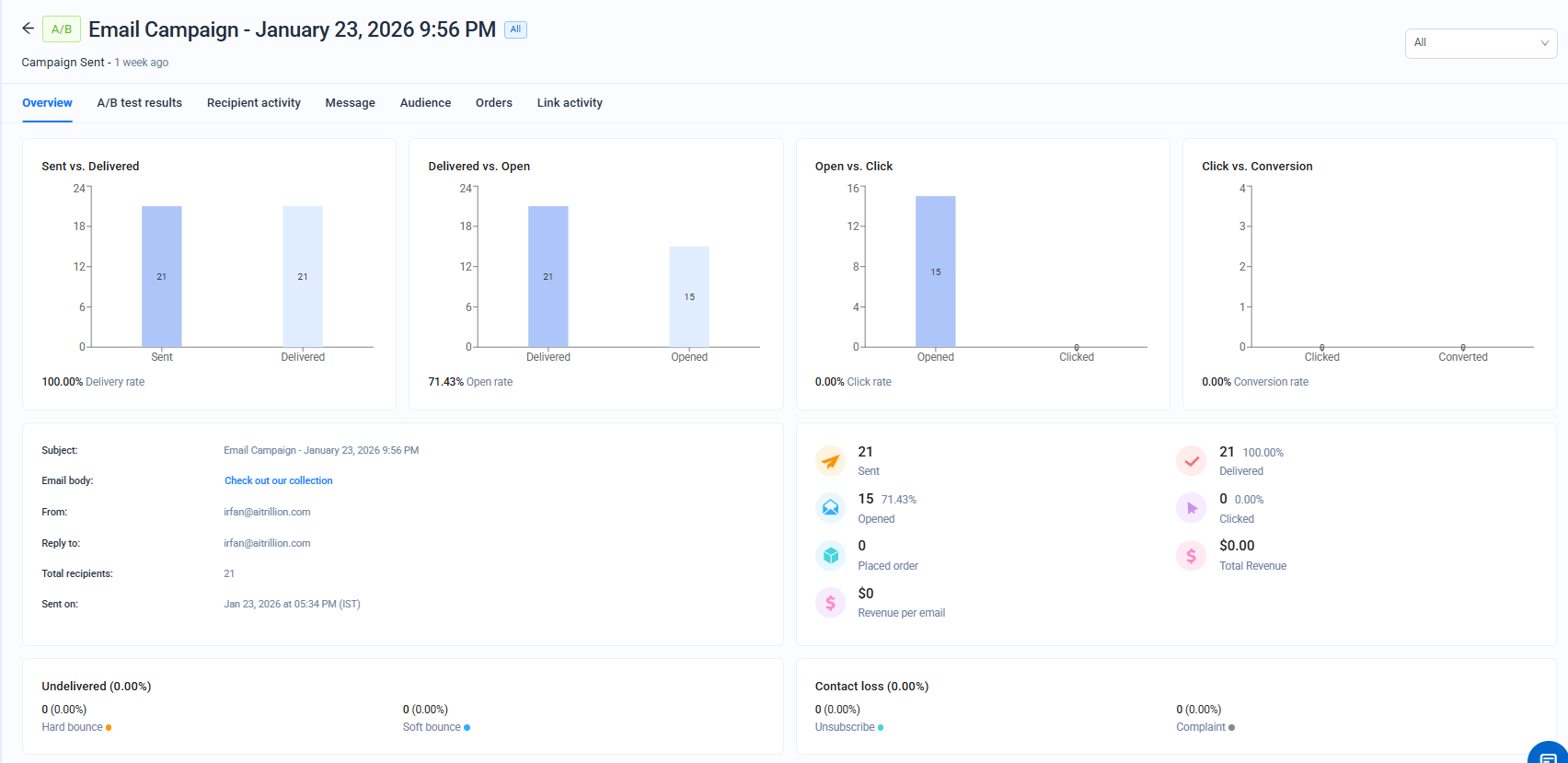 A/B Test Results – Performance comparison between variants. (Shows only if A/B test campaign has been sent)