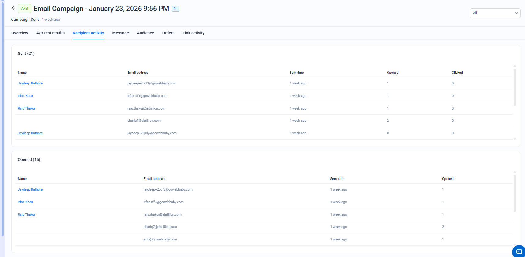 Recipient Activity – Individual recipient engagement details (Sent/Open).