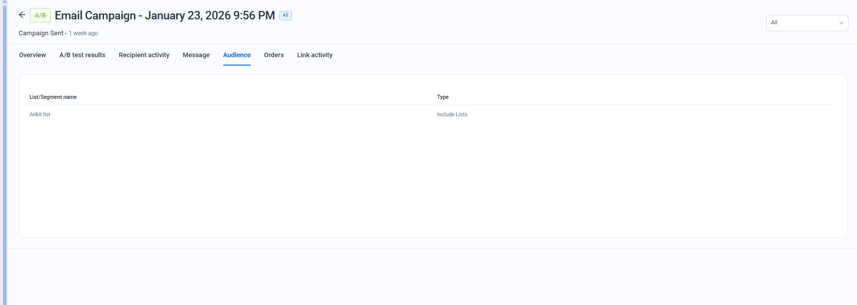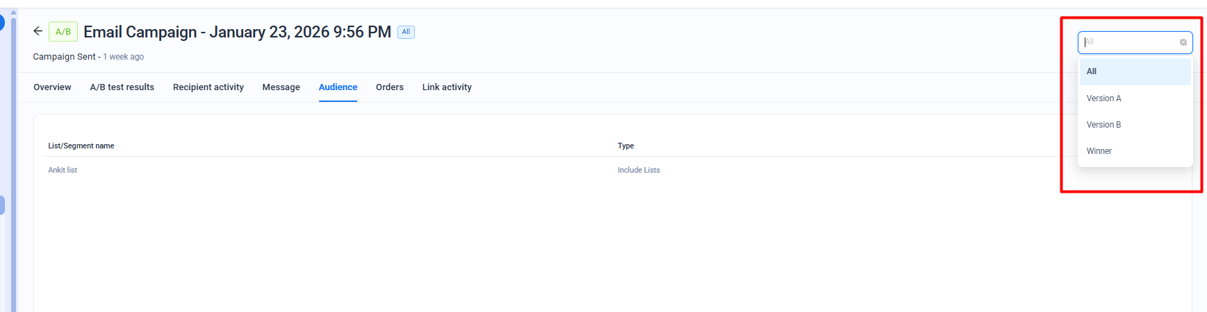 You will also get details of the targeted list/segment on the A/B test version. For example, Version A, Version B, or the Winner audience.