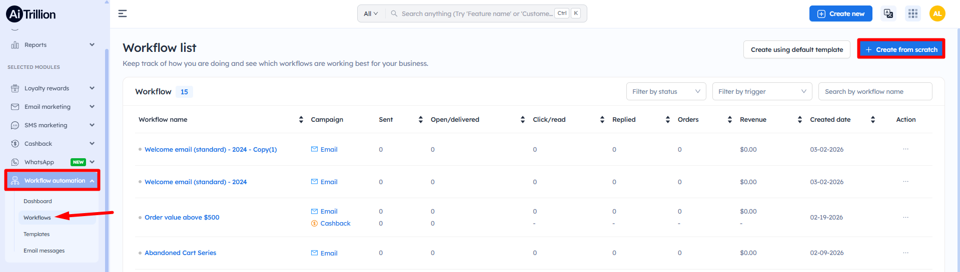 Creating a workflow automation manually allows you to design fully customized customer journeys based on your specific business needs. Instead of relying on pre-built templates, you can define your own triggers, conditions, and actions to control how and when your communications are sent.