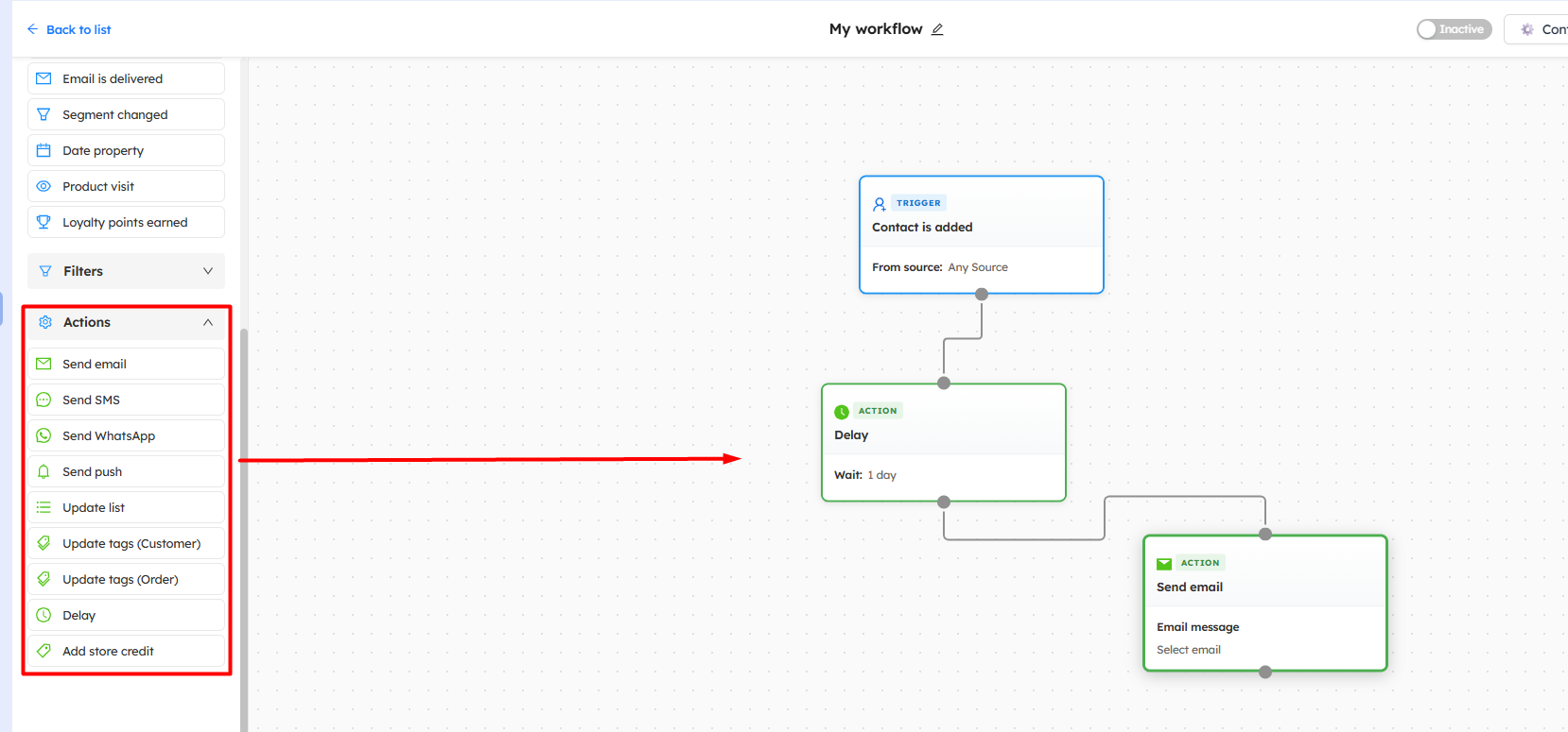 Step 4: Drag and drop any delays or actions of your choice and click on them to choose their options. An example is shown below in which Send Email from Actions is added and connected with a trigger block.