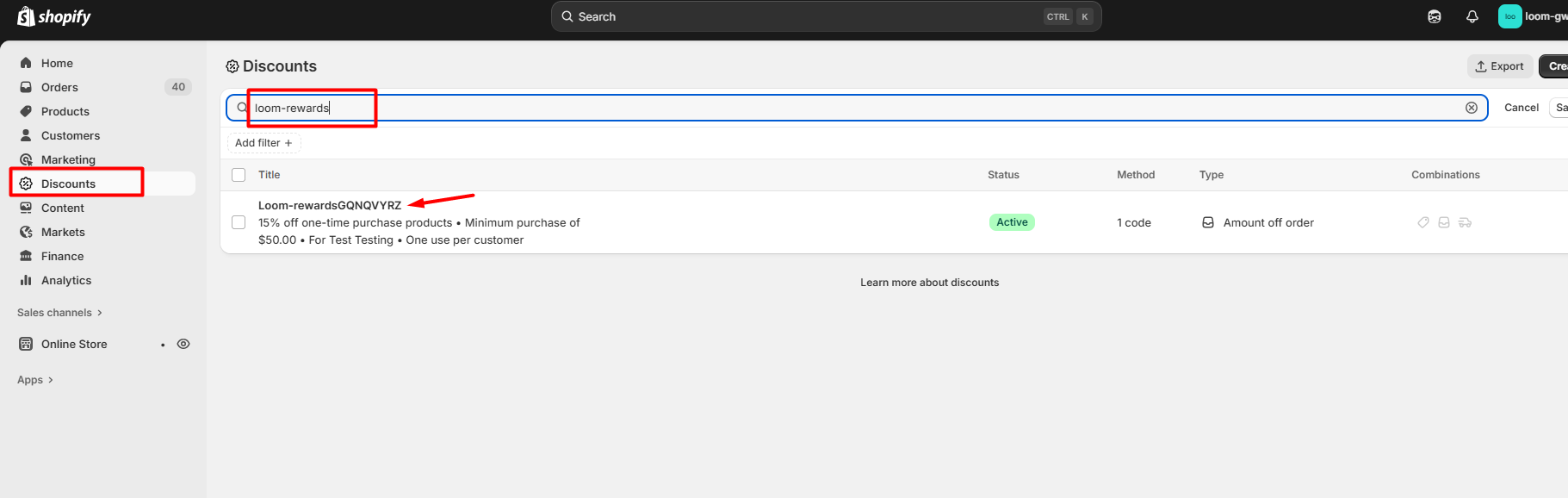 Now, whenever customers redeem rewards, the discount codes generated in Shopify will appear with the prefix you have set. To check this, go to Shopify admin >> Discount code and search for the prefix that you have set.
