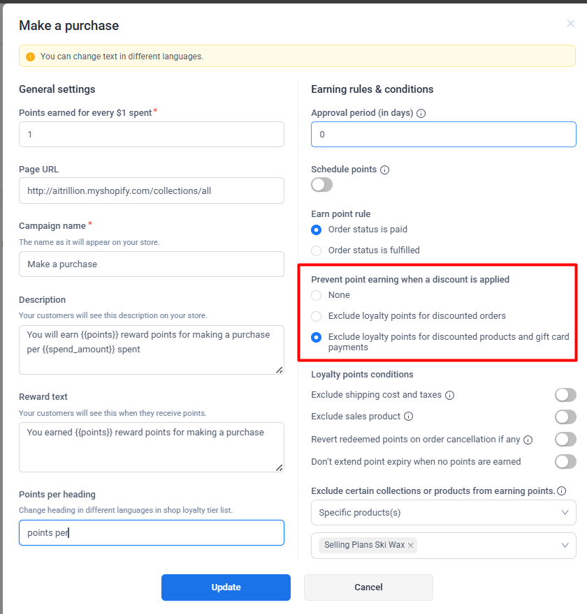 Now, the customers will not earn points either on loyalty points for discount orders or on discount products and gift card payments.