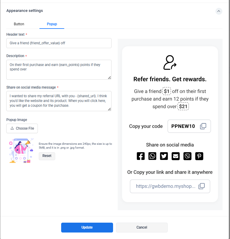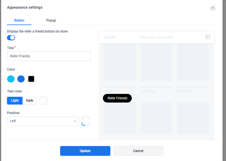 Step 3: If you want to show a special 'Refer a friend' button, then enable the same from the appearance settings under Refer a friend. You can also customize how the button or pop-up is shown on the website