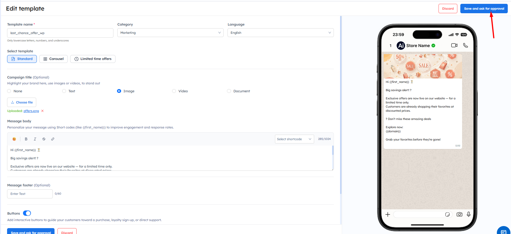 Step 2: Edit the template as per your need and click on Save and ask for approval.