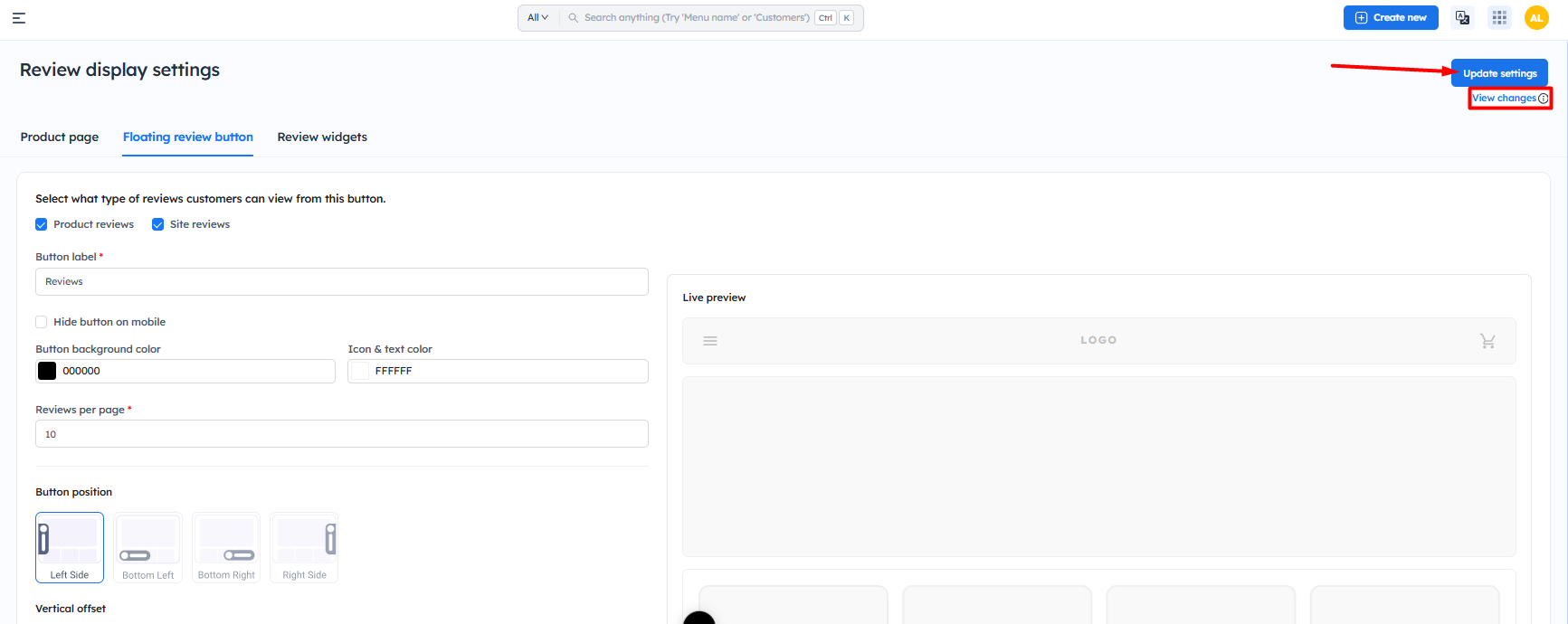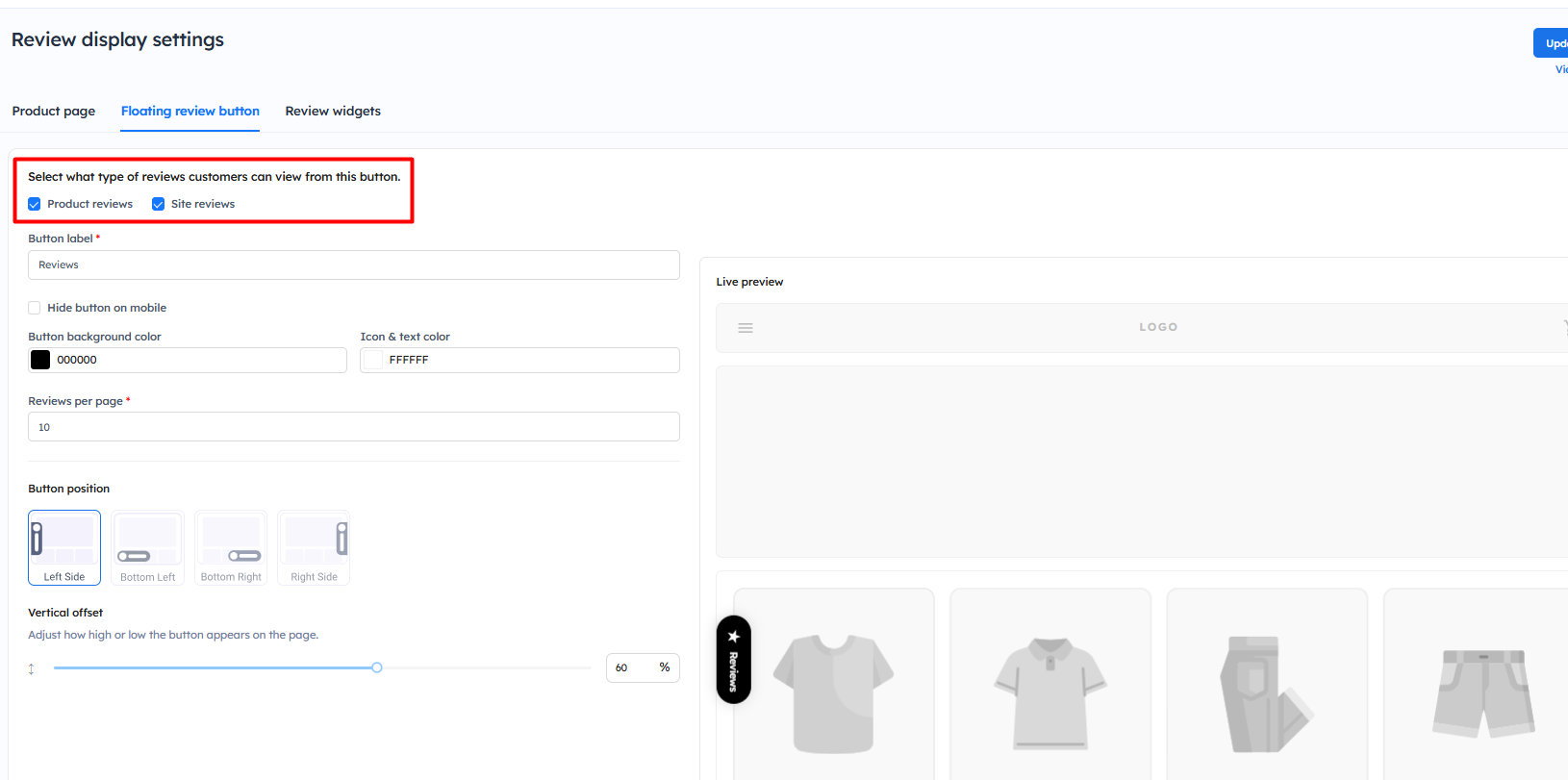 If both Product Reviews and Site Reviews are disabled, the floating button will be hidden from the storefront.
