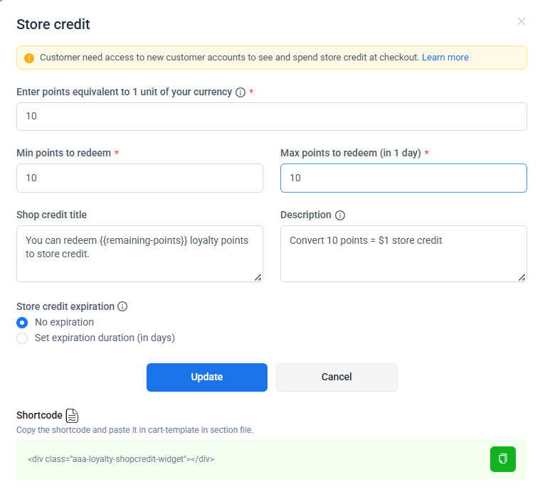 Note: Only the store owner can enable the store credit permission on their Shopify store.Enter Points Equivalent to 1 Unit of Currency: Define the conversion rate for store credits.