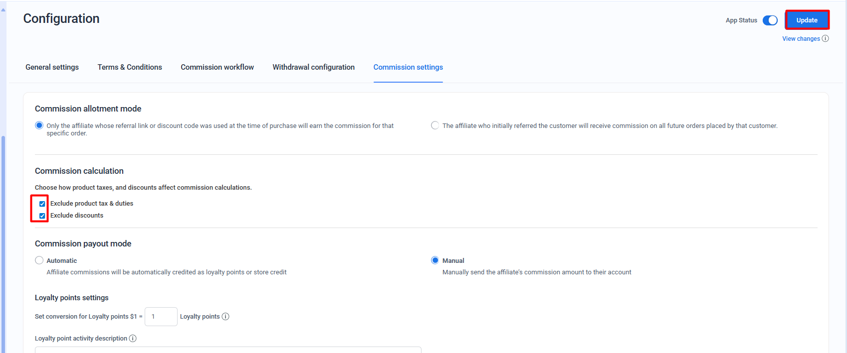 Step 2: Go to the Commission settings tab and enable the settings according to your needs, and click on Update.