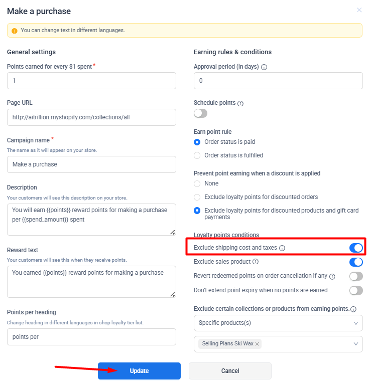 Here are the steps to exclude shipping costs and taxes from the earn points: