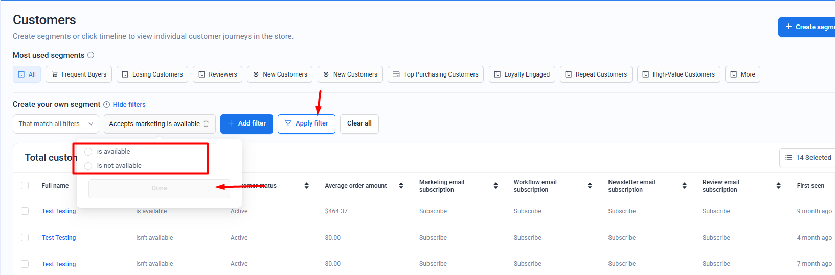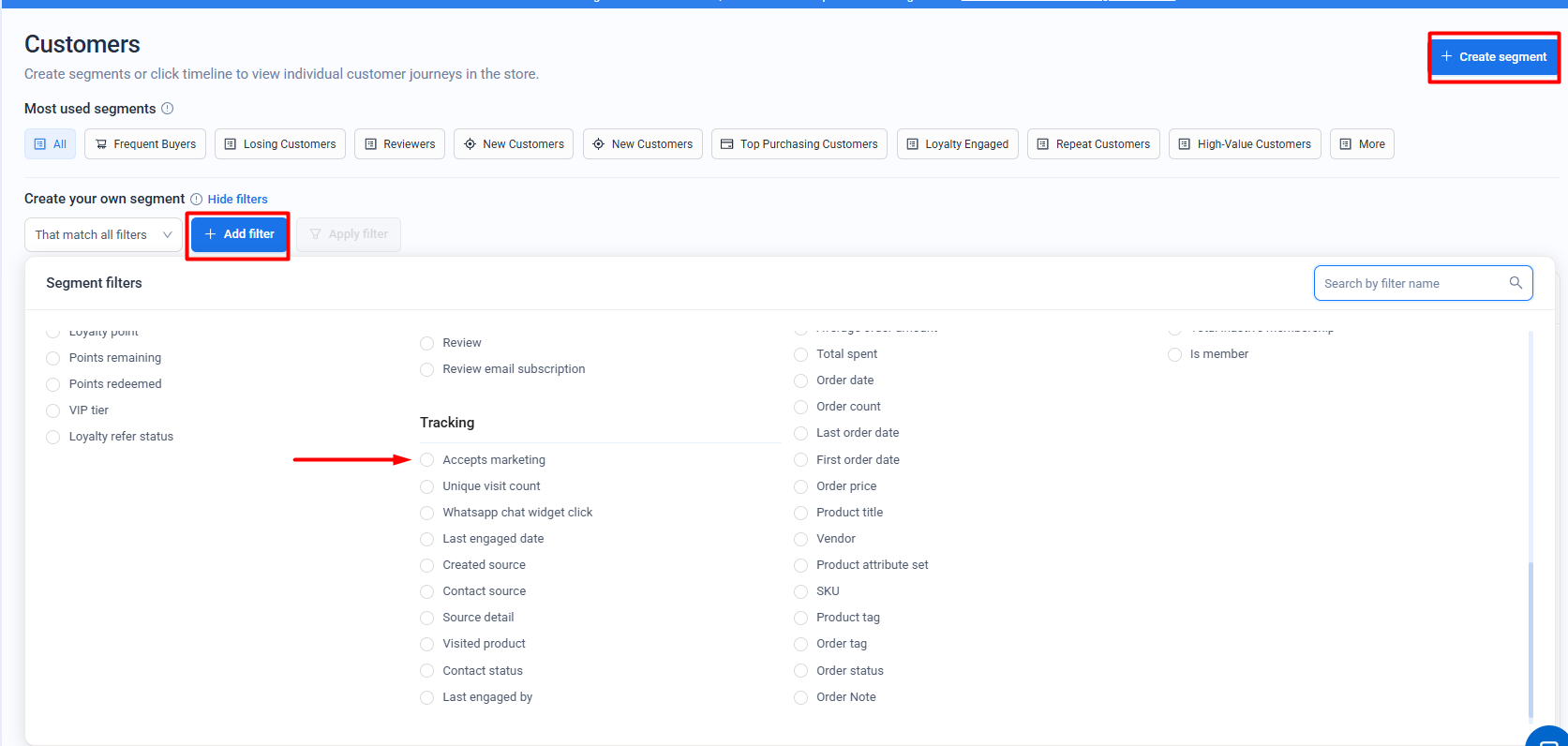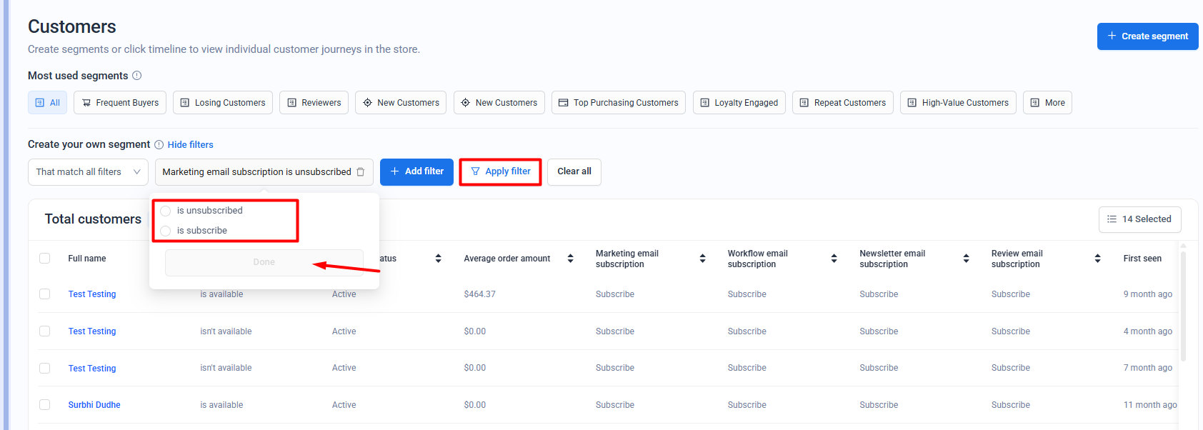 Step 2: Click on Create segment button >> Add filter >> search for Marketing email subscription