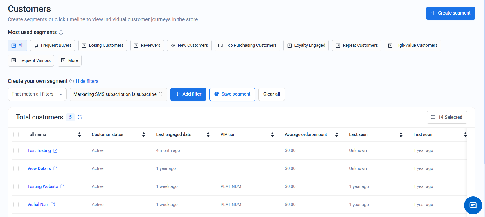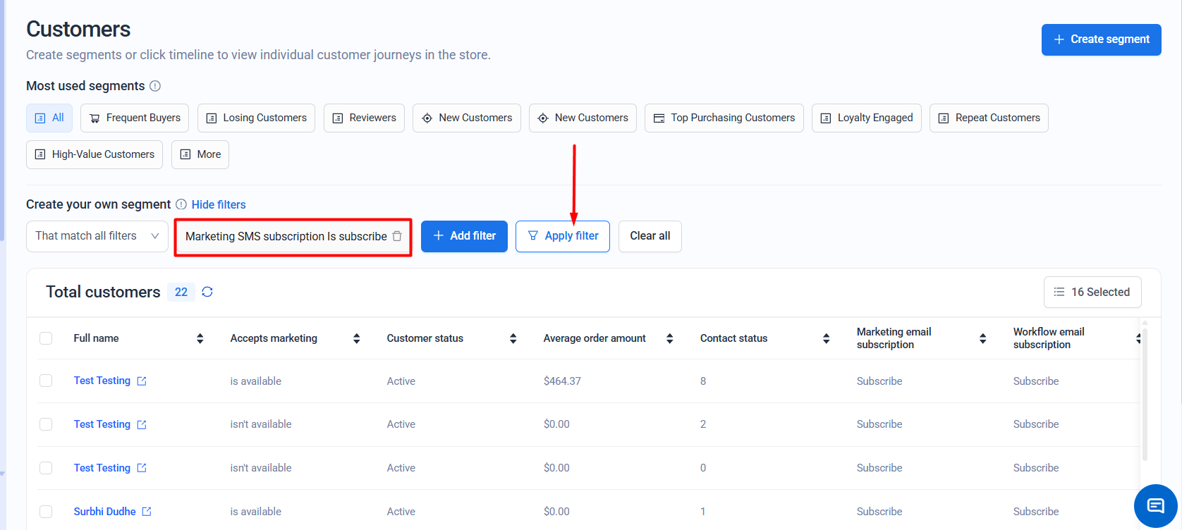Make sure customers have a valid phone number saved in their profile to appear in SMS-related filters.