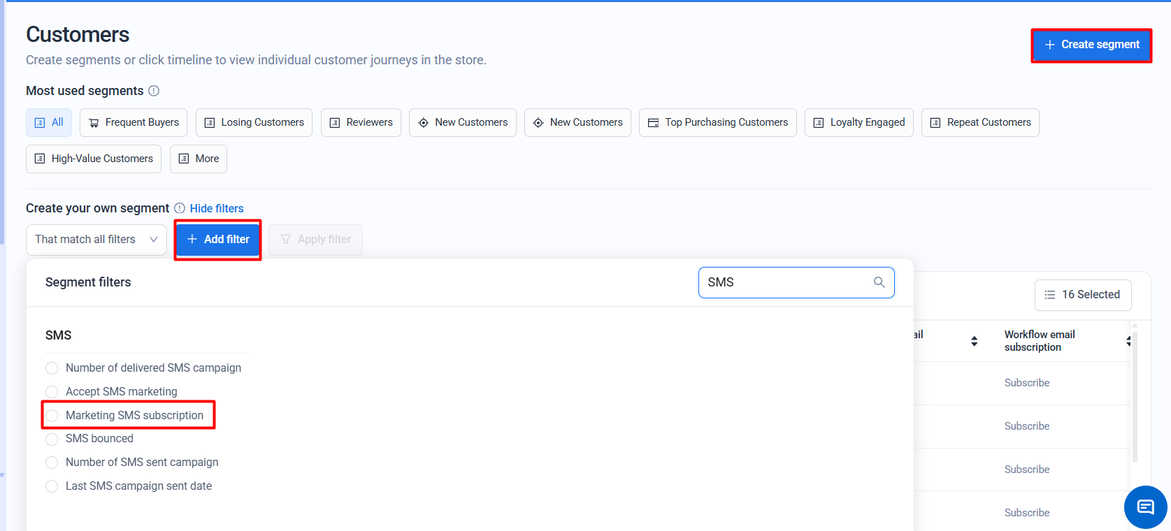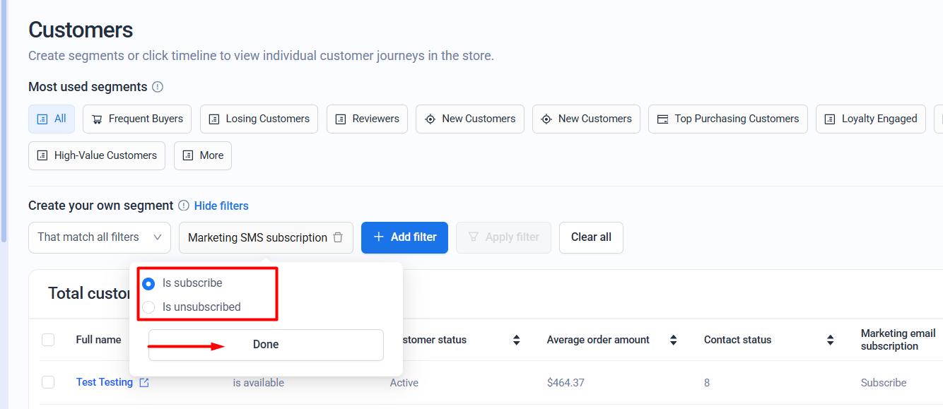 The SMS marketing subscription filter is based on the customer’s consent status synced with Shopify.