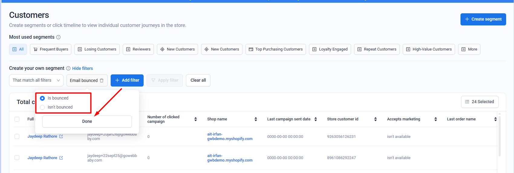 - “Is bounced” will show customers whose emails/SMS failed to deliver, while “Isn’t bounced” will show customers with a successful delivery status.
