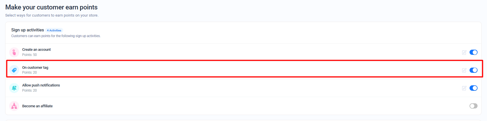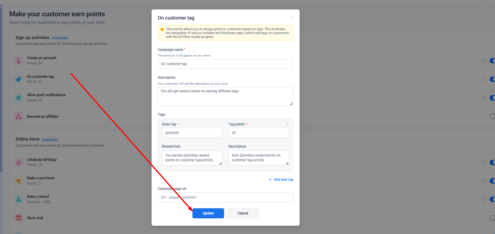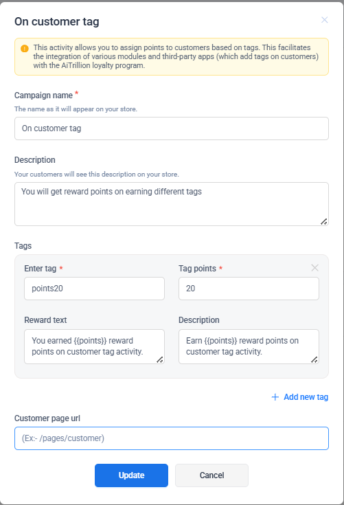 Giveaway of loyalty points on newsletter signup and customer tags