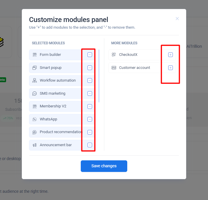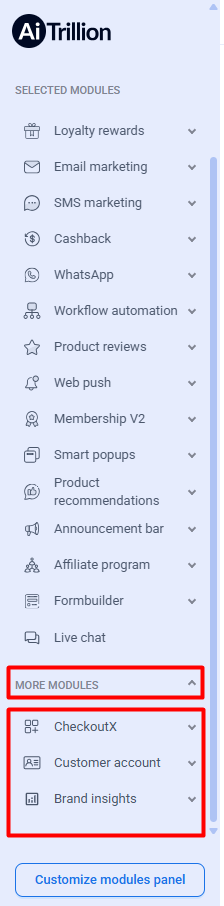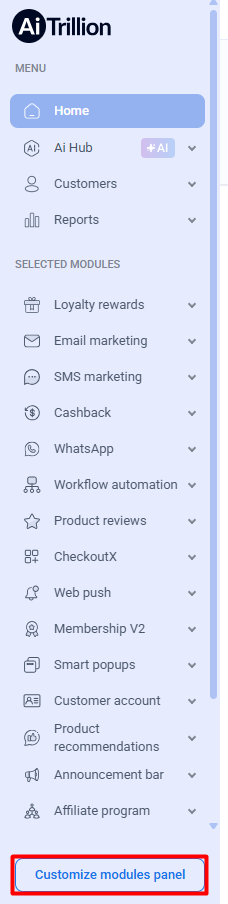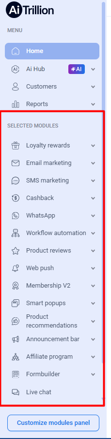 The module panel lets you control which AiTrillion modules appear in your dashboard and how they are organized for quick access. By customizing the selected modules, you can keep your workspace focused on the features you actively use, while hiding unnecessary modules. This article explains how the module panel works with selected module customizations and how you can easily add, remove, and manage modules to create a cleaner, more efficient navigation experience.