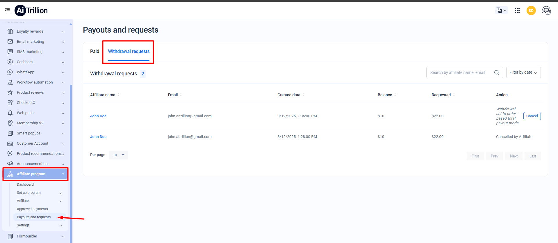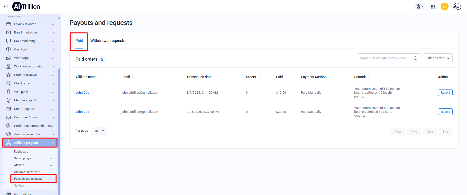 Step 8: You can check all affiliate withdrawal requests and paid details by going to the Affiliate program >> Payout and request :