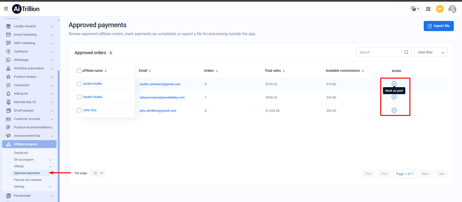 Step 11: You can pay the affiliate by visiting Affiliate program >> Approved payments: