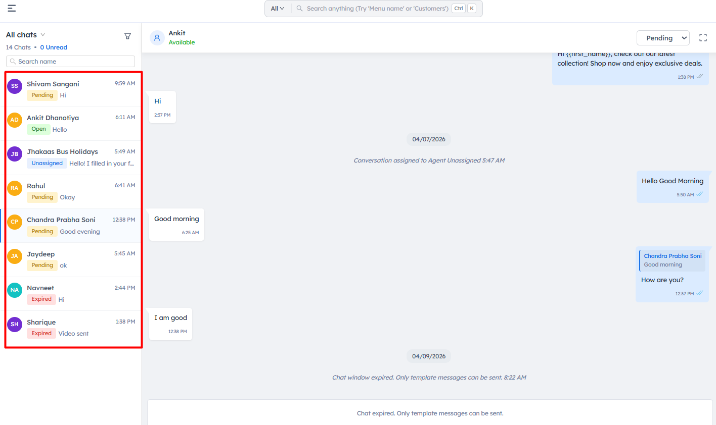 Introduction The Team Inbox (WhatsApp) enables you to efficiently manage all customer conversations from a single, centralized dashboard. It allows your team to view, organize, assign, and respond to WhatsApp messages in real time, ensuring no ...