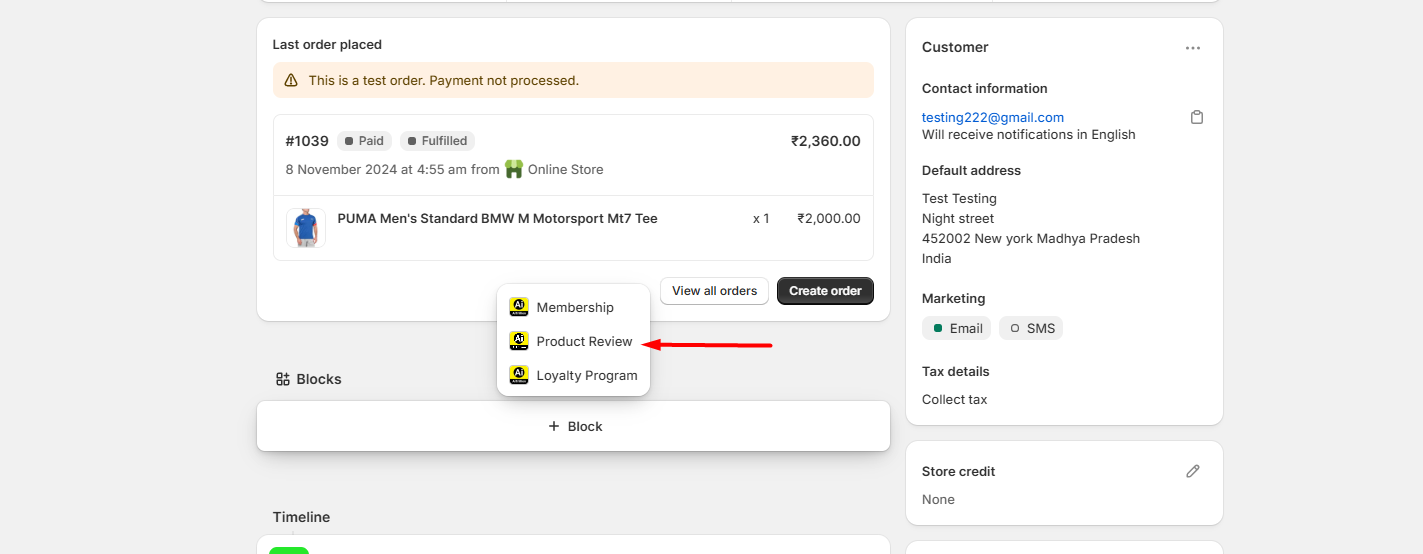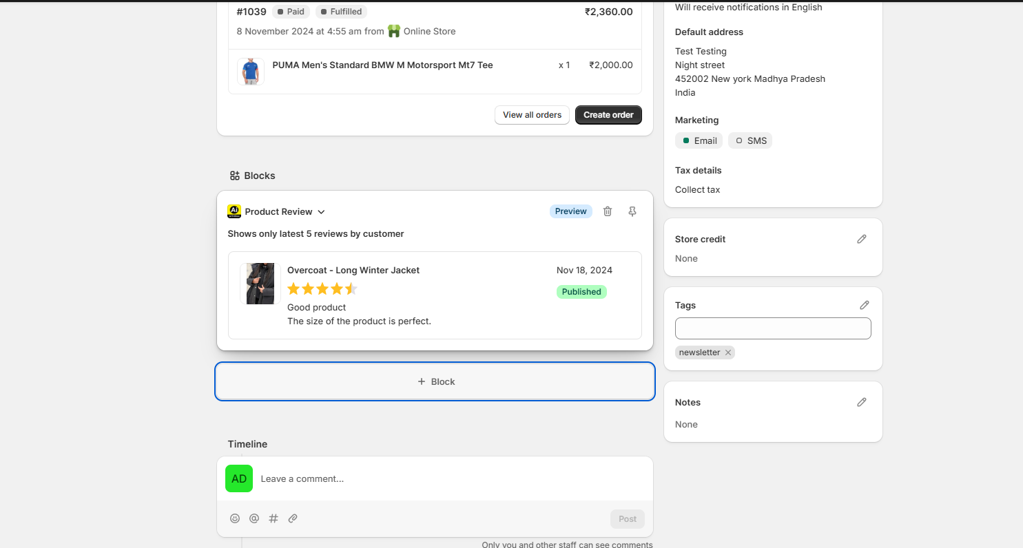 The AiTrillion Product Review Block allows you to view a customer’s latest product reviews directly from the Shopify admin customer profile page..
