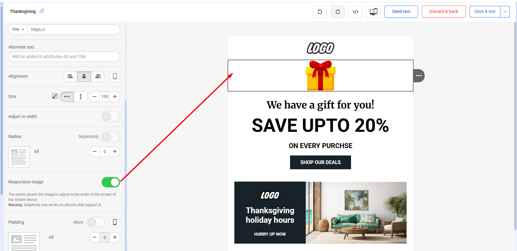 To adapt your images to the mobile screen, enable the "Responsive Image" control: