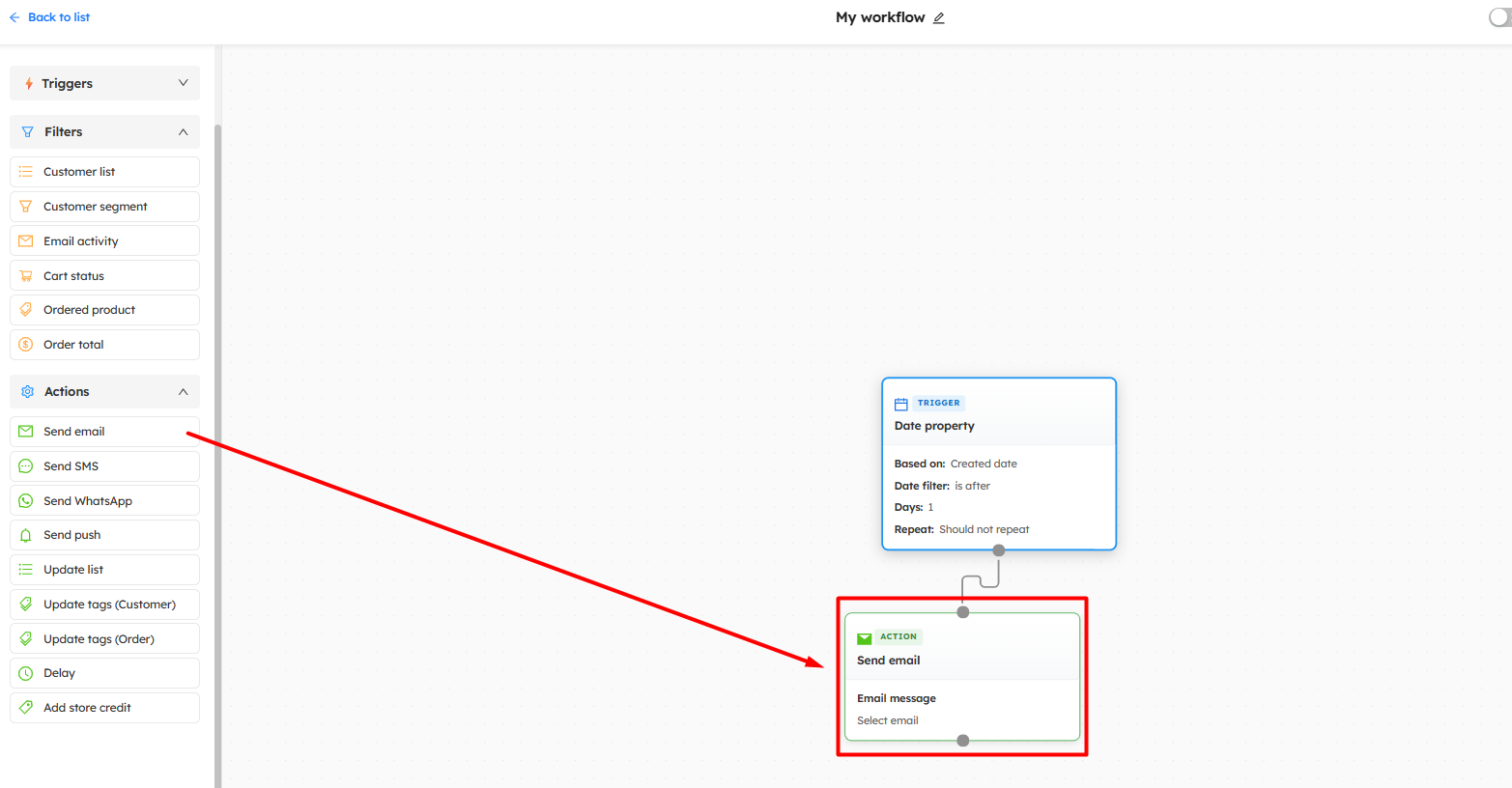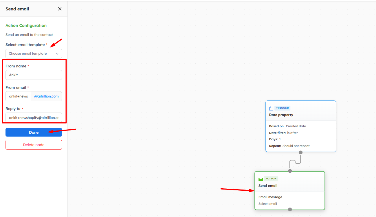 Step 6: Click on Send email action, which has been added to the workflow editor. A left menu will appear, select the email template, add the required details, and click on Done.