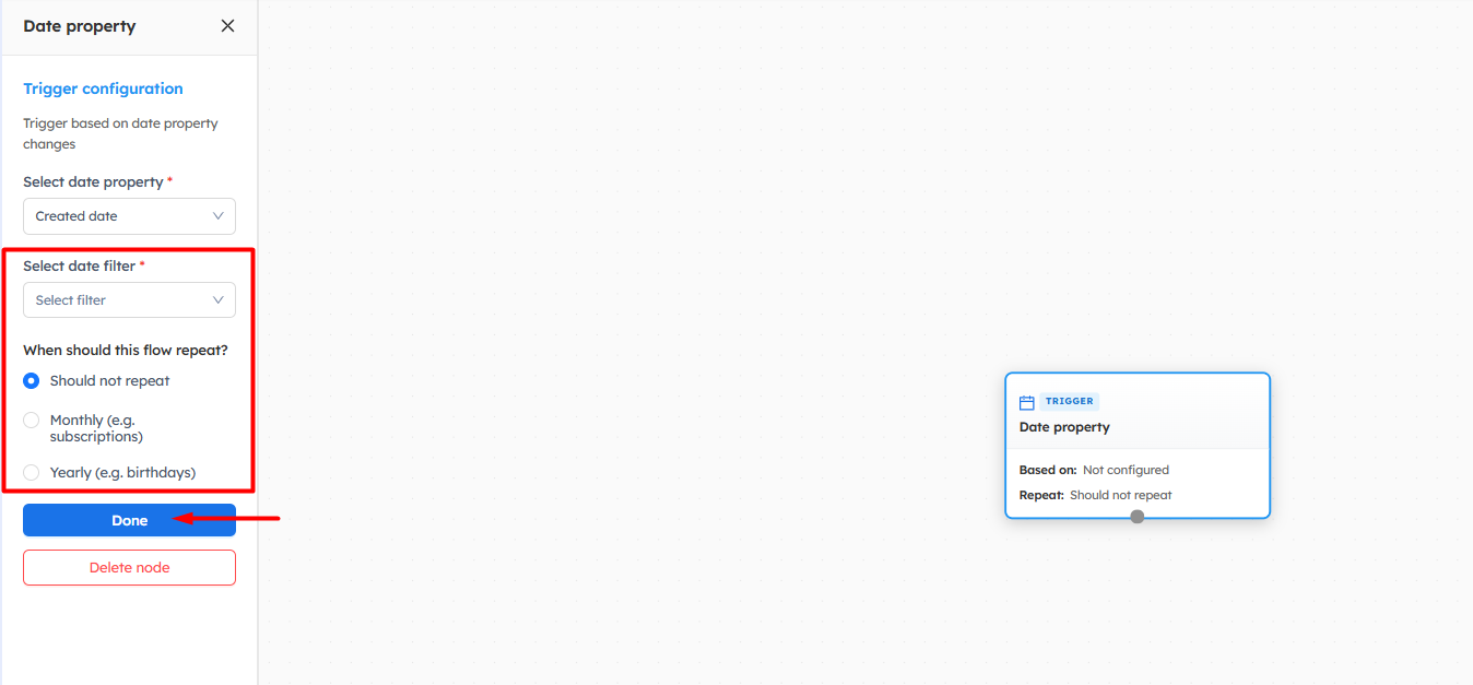 Step 4: Select the date filter and choose whether the flow should repeat or not. The available date filters are: