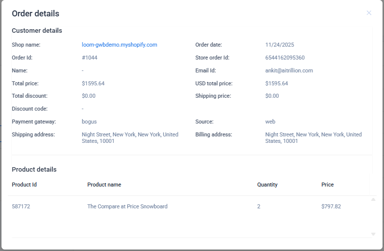 - Order details shown in the report are fetched directly from Shopify, ensuring accuracy for billing, shipping, discounts, and payment information.