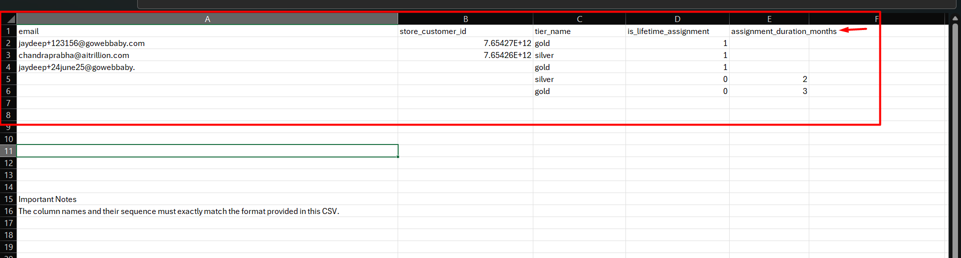 5. assignment_duration_months: Required only if is_lifetime_assignment is set to 0. It defines how long (in months) the VIP tier remains active. Leave this column empty if the assignment is lifetime.
