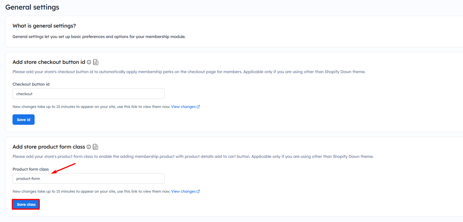 <div> class of the <form> or product-form is added in the Membership V2 general settings. Missing or incorrect classes can prevent the product from being added to the cart. - Always copy the class from the parent container, not just the