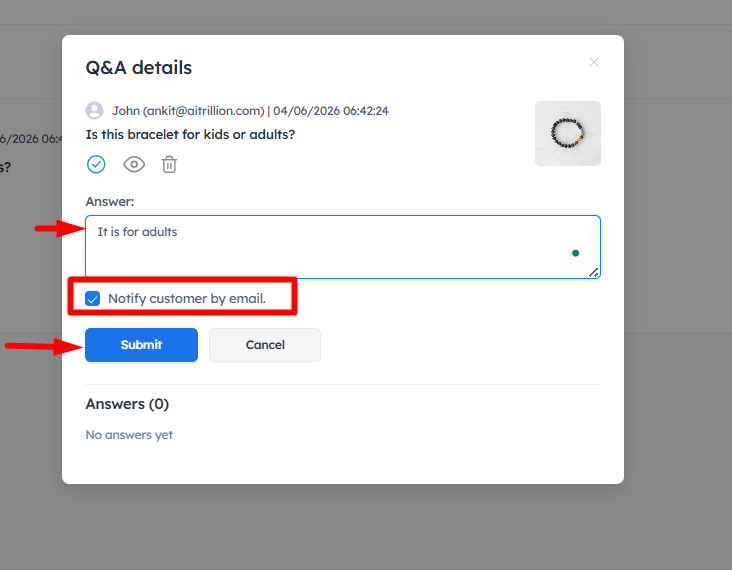 Step 3: Now, a pop-up will appear. You can add the answer as per your need, enable the Notify customers by email settings, and click on Submit button.