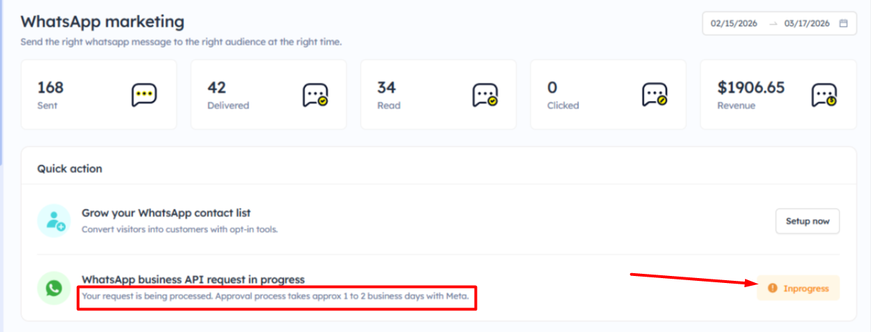 - WhatsApp business approval: It will take 1-2 business days for approval of the WhatsApp business account with Meta approval.