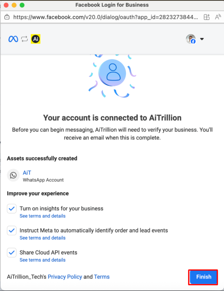 g. Congratulations! Now, your WhatsApp business account has been successfully created, and AiTrillion will start the verification process.