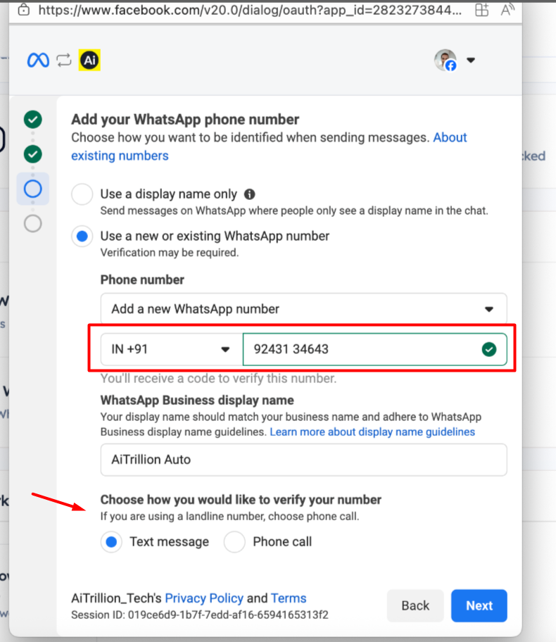 f. Click on the Next button to Approve the consent to send a WhatsApp message through AiTrillion.