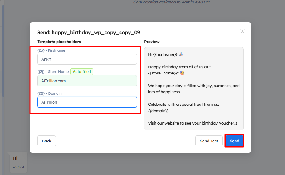 Step 5: Add the placeholder data, which will replace the shortcode with the actual text in the message, and click on the Send button.