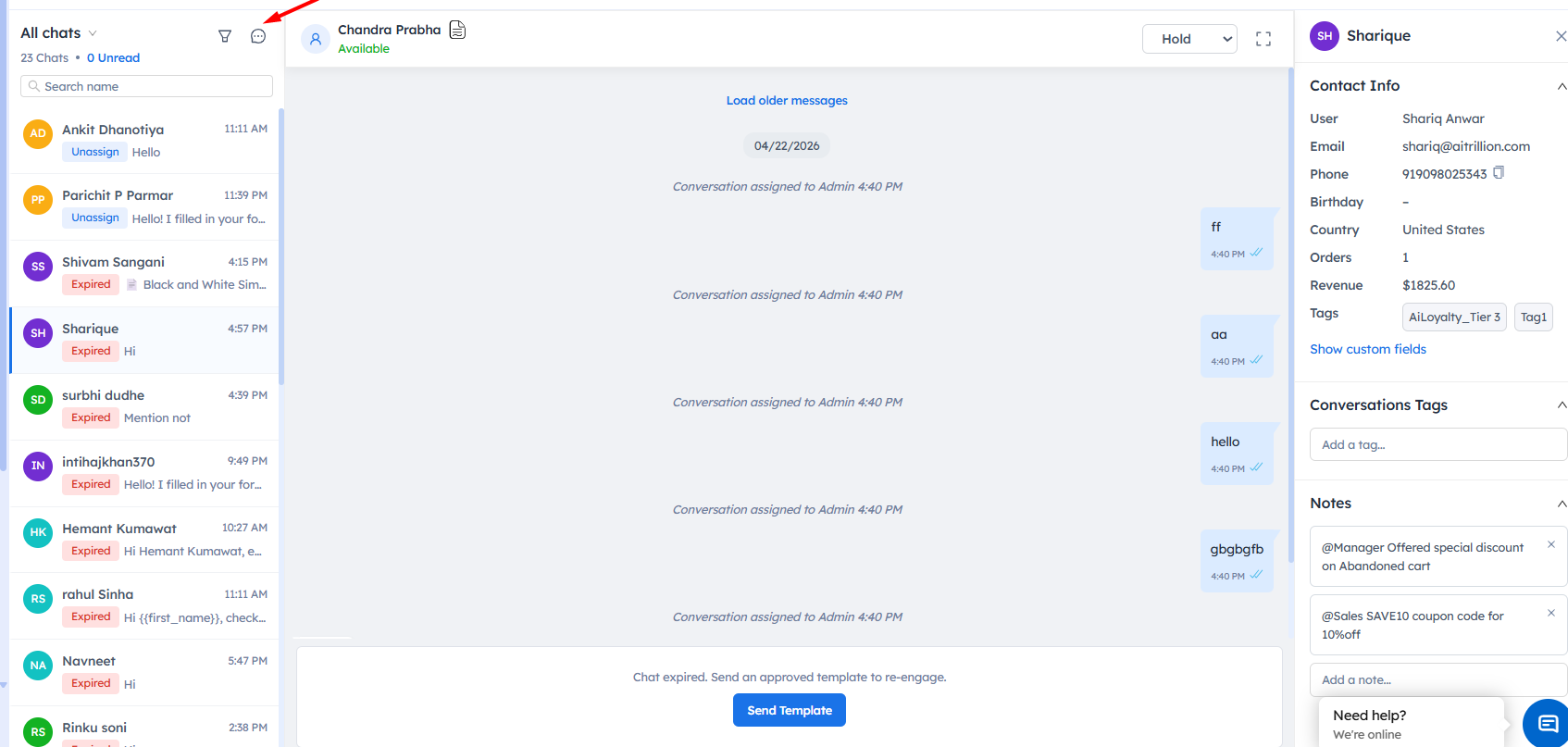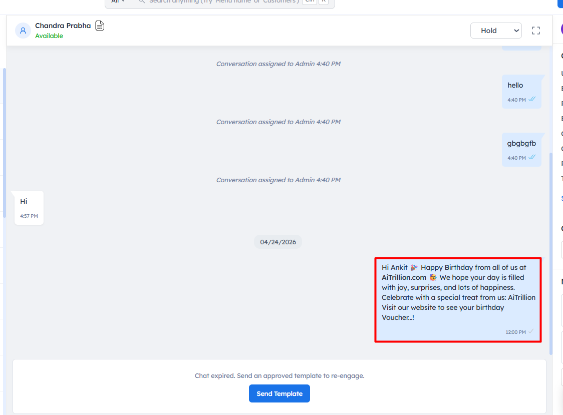 - Once the customer replies, you will see a 24-hour session timer, after which it will expire.