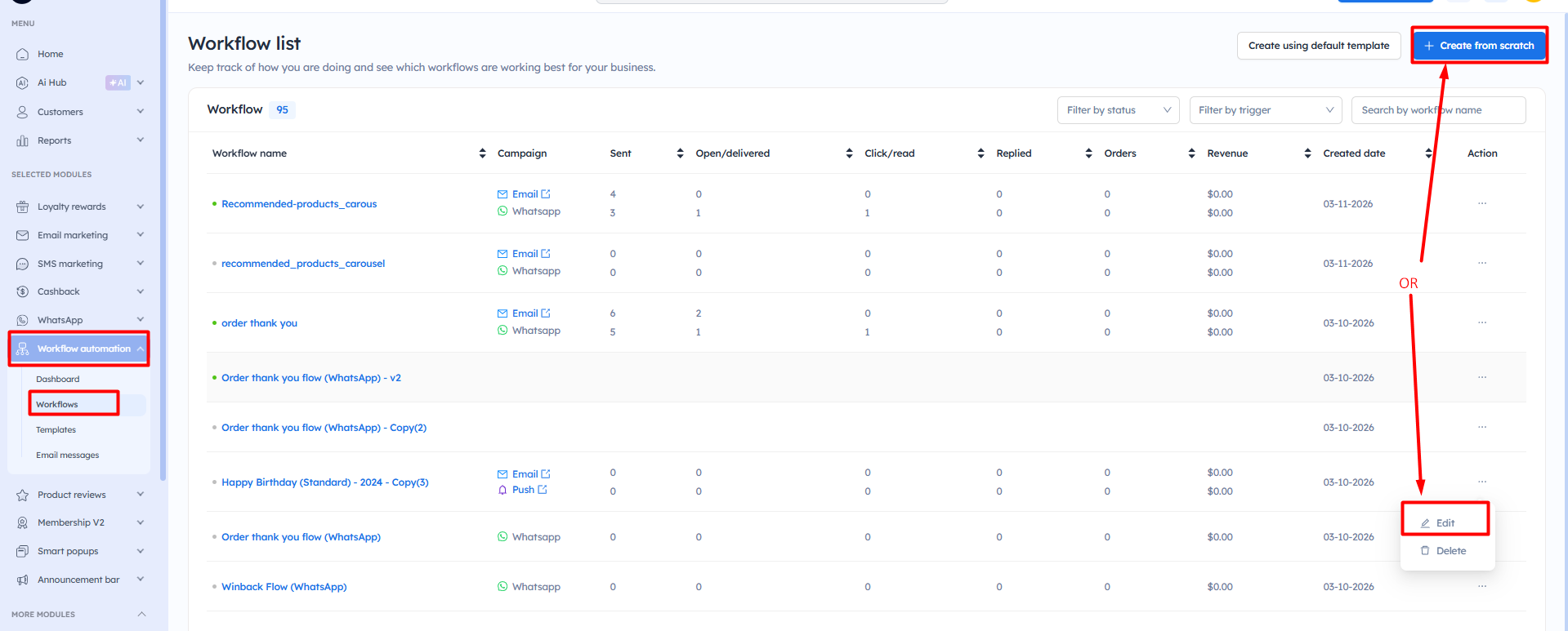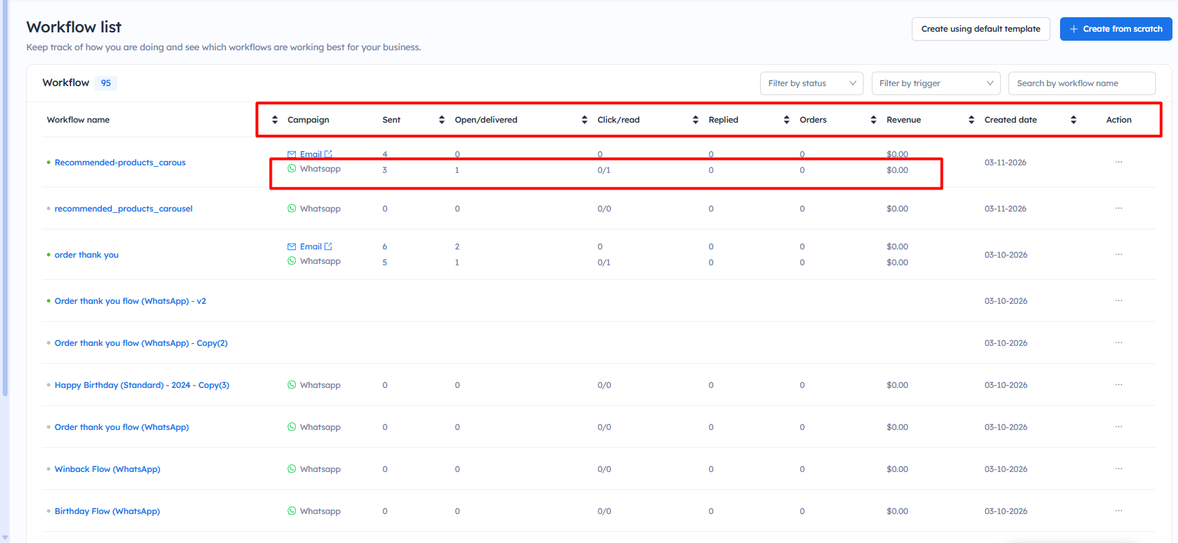 Once the customer enters the workflow, you can check the report of No, of sent, Open/delivered, Click/Read, Replied, Order, Revenue, and Created date