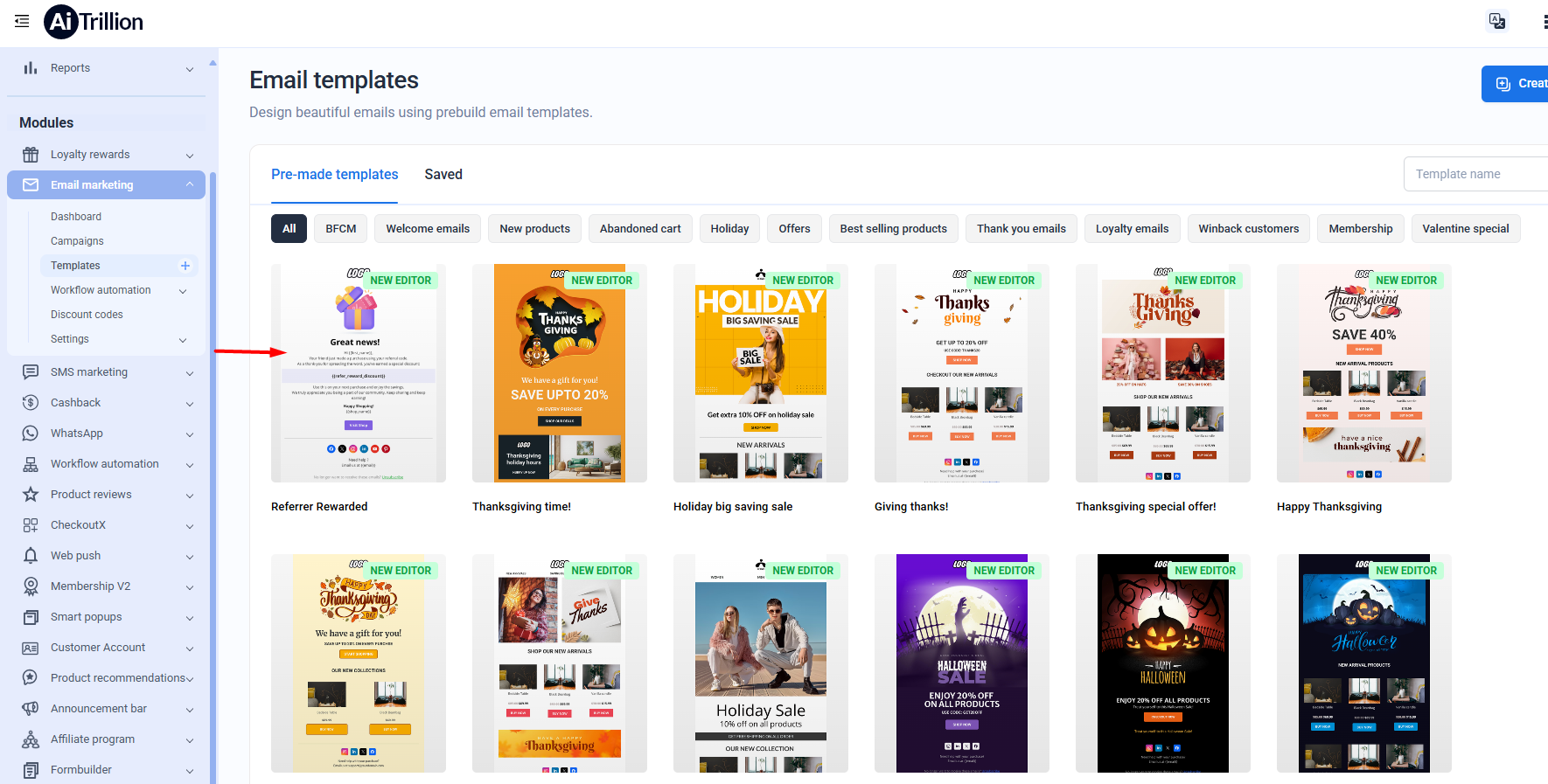 Note: The pre-made template is already available for referring a friend. To get a Pre-made template, Go to Email marketing >> Templates >> Click on Pre-made template to edit the
