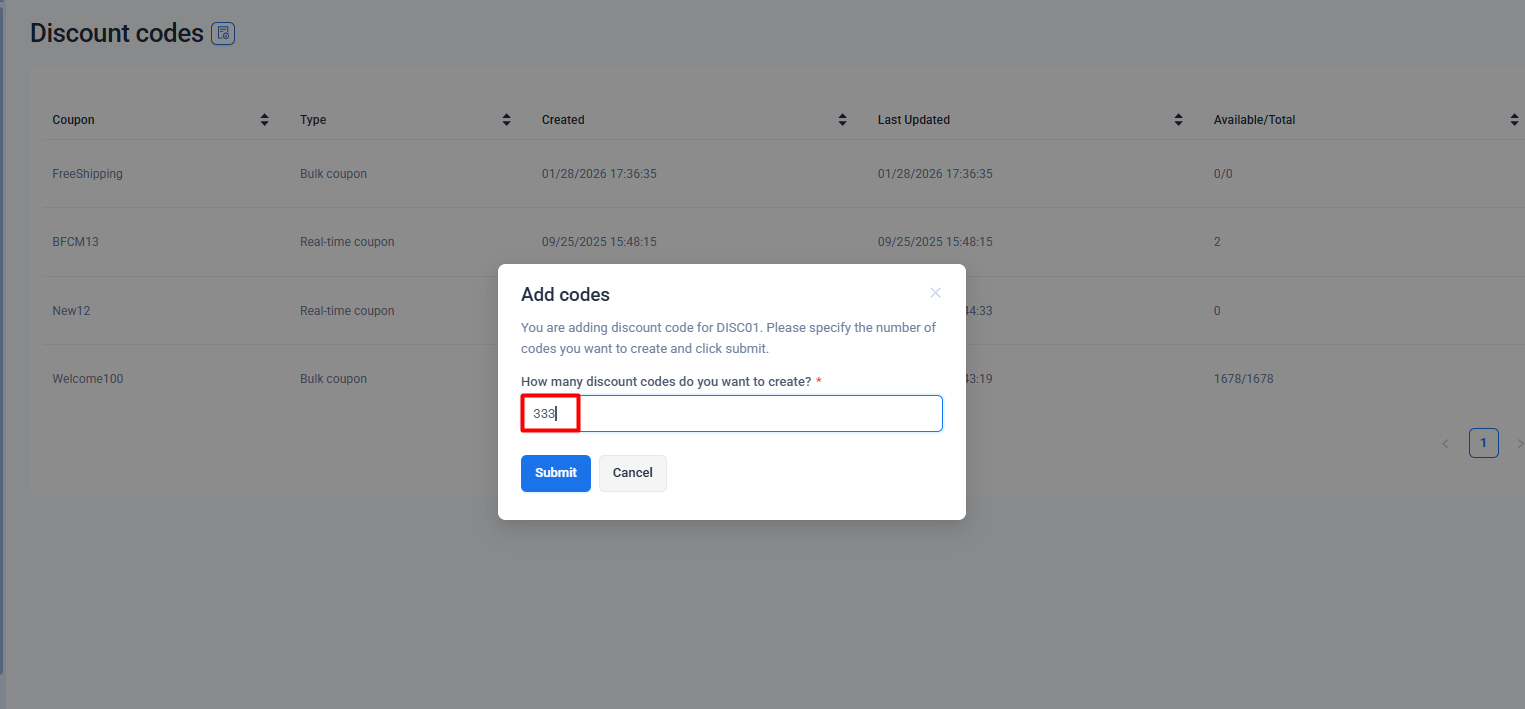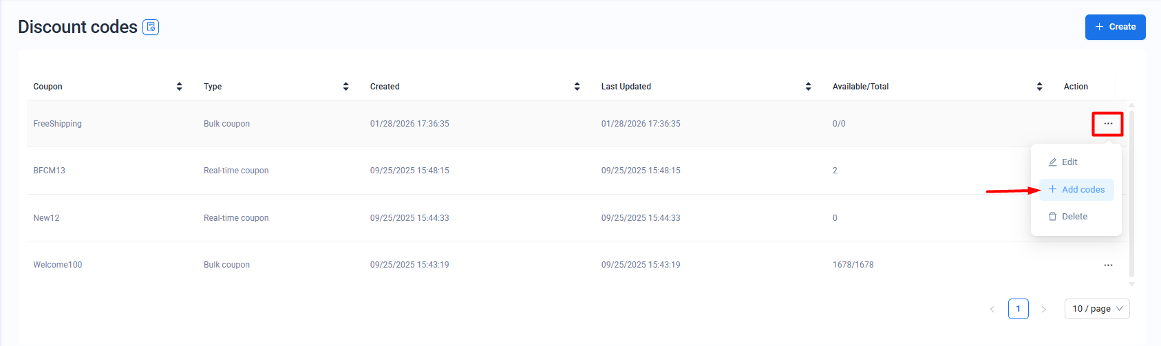 Step 5: If you are using a Bulk discount code generator - Go back to the Discounts code screen. Click here to visit the discount code page. Click on the three dots and then on Add Codes to add the total number of codes.