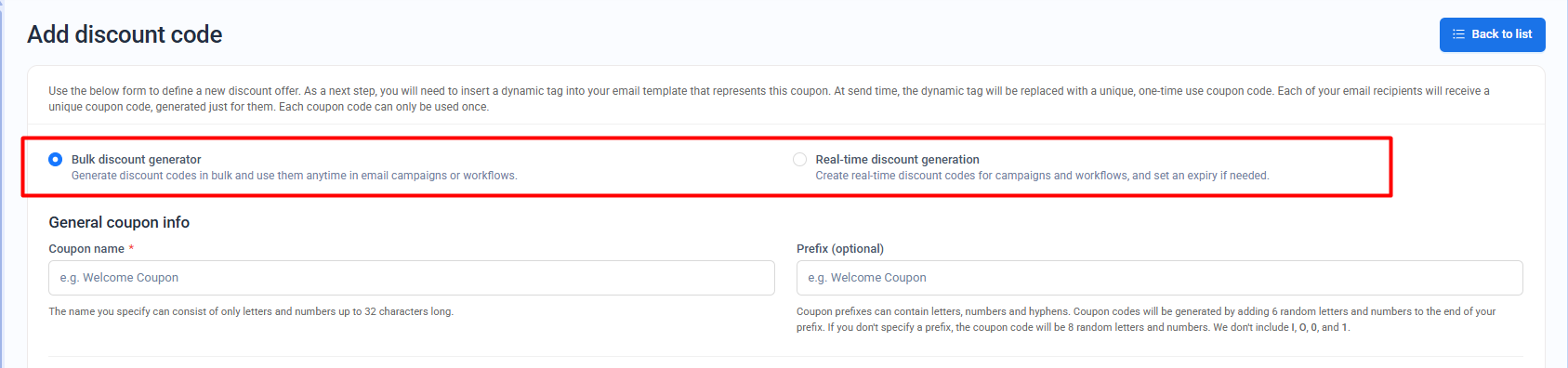 A custom prefix can be added to each generated coupon code (e.g., "WELCOME").